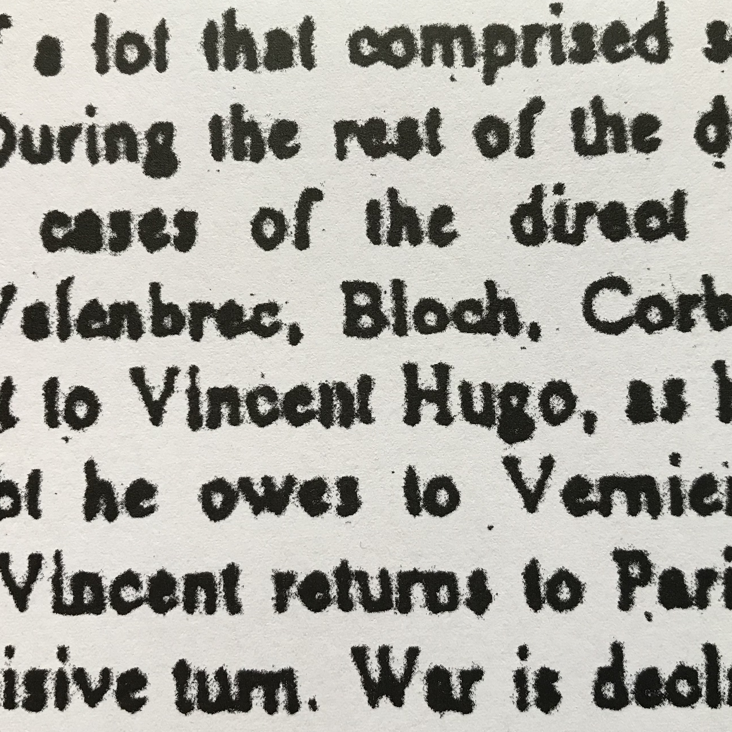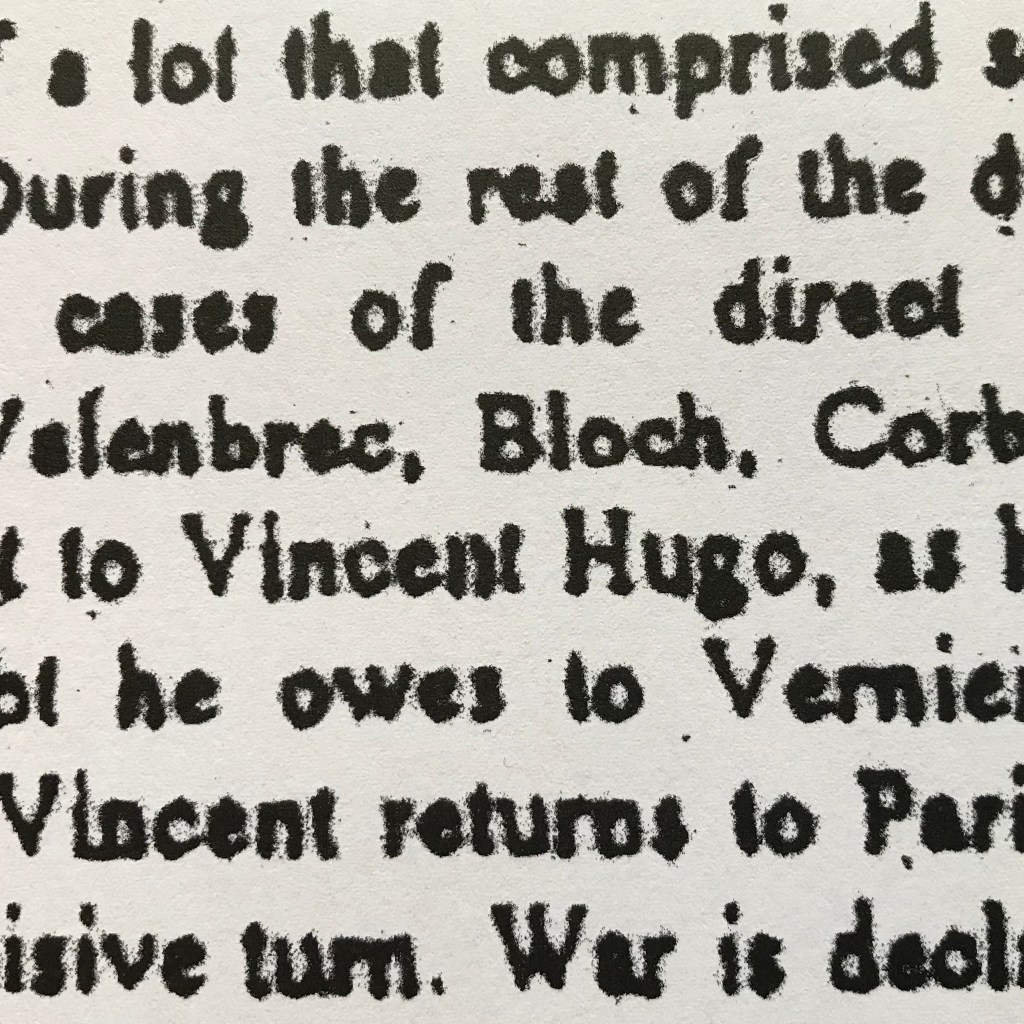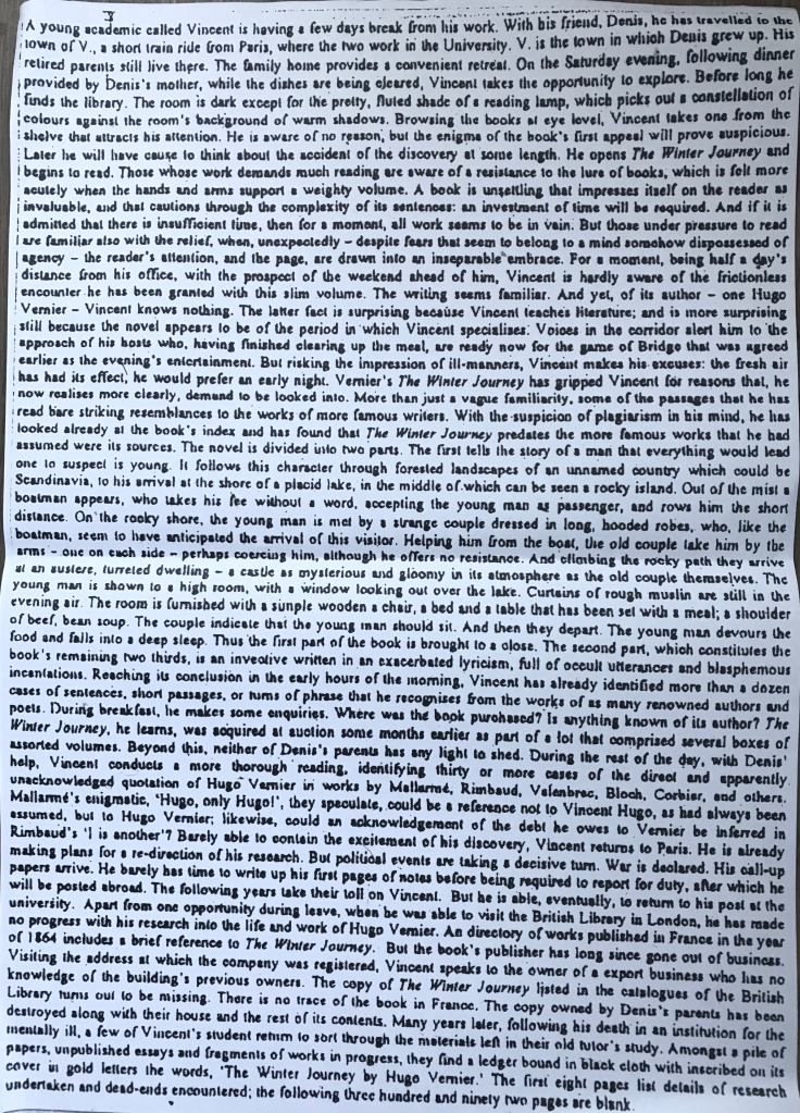The photocopied page represents an impoverished version of a story by Georges Perec called The Winter Journey (1976)—impoverished because it is rewritten from memory. A character named Vincent experiences a moment of compulsive reading. A book in his friend’s library attracts his attention for reasons he cannot quite identify. Then when he starts reading, he is hooked. The passage in the rewritten version that stands out does so because it marks a limit of the rewriting exercise. It is the place—the most obvious place, maybe there are others—where the writing becomes more than a simple retelling of the story, where it begins to elaborate.